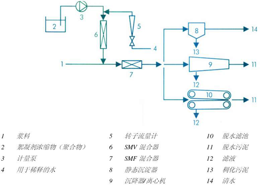 為使絮凝劑具有最佳的活性,在將其加入到污水之前,必須使用體積為10-100倍的水來稀釋。由于初級溶液在一般情況下都為高粘度溶液,在水中不能夠自動的被稀釋,因此要確?;旌系膹氐仔?。高分子聚合物在水中分布越均勻,則其活性也越大。使用靜態混合器能夠確保有效混合。靜態混合器的使用能夠減少絮凝劑的使用量,因此能夠節省成本。