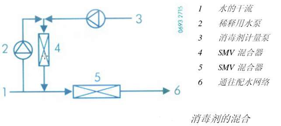 次氯酸鈉在水溶液中離解成HOCl 和OCl - 離子,即有效游離氯,其中HOCl 起主要殺菌作用。處理后的中水中殘留的有機物與有效氯生成的化合物無殺菌能力。為了充分發揮HOCl 的殺菌作用,要求在加次氯酸鈉后HOCl 尚未與有機物反應之前,在幾秒時間內迅速完成殺菌作用。中水處理后投加次氯酸鈉消毒時,快速混合接觸極為重要。